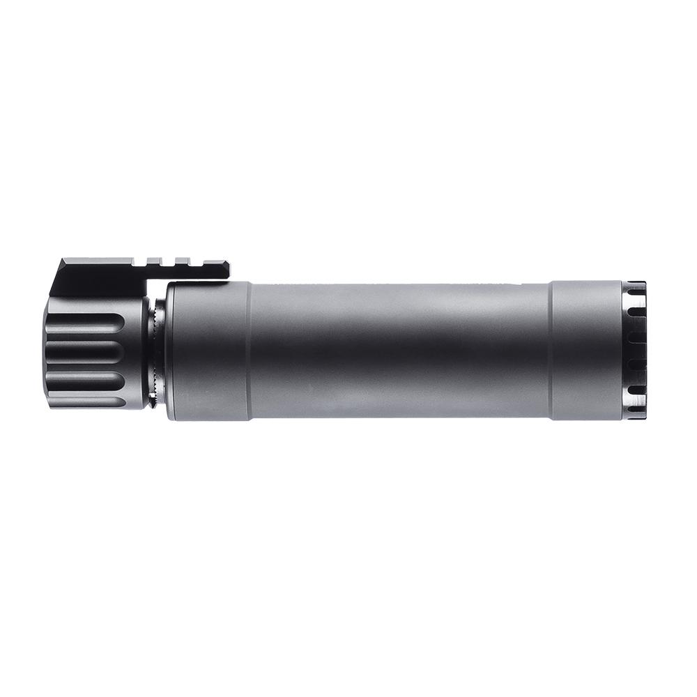 The TP9 RBS suppressor is the ideal addition to the TP9 PDW/MP9 submachine gun. Thanks to its QD-lock it can be mounted/dismounted in a matter of seconds. An integrated NAR/Picatinny rail mount allows the addition of illuminators and/or aiming lasers. Depending on suppressor installation this rail section can be positioned at either the 10 6 or 2 o’clock positions. This updated TP9 suppressor features Reduced Backpressure System (RBS) technology significantly reducing the gas blow back to the shooter all while maintaining the same level of flash and sound reduction of the legacy variant.