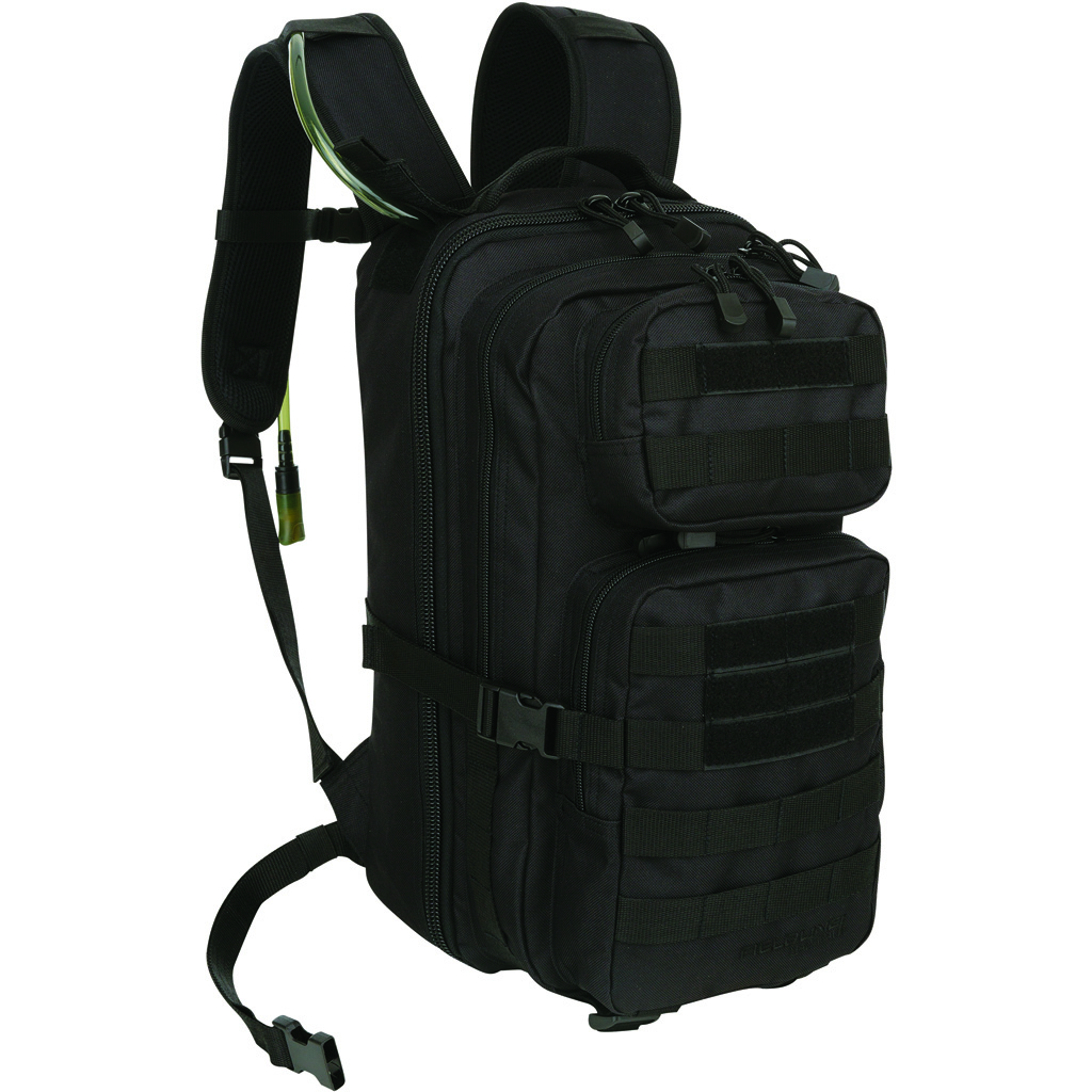 Features:Designed for law enforcement, military, hunting, and outdoor activities;Spacious main compartment with clamshell-style opening;Secondary compartment with three internal pockets for organization;Two front zippered cargo pockets with MOLLE webbing for gear attachment;Adjustable shoulder straps with sternum slider for a secure fit;Side compression straps and webbed waist belt for stability;Includes a 2-liter BPA-free hydration reservoir with a high-flow bite valve;Left and right hose ports for easy access;Dimensions: 9.2″ x 17.7″ x 6.9″;Storage capacity: 22.2 liters (1356 cubic inches);Weight: 2.46 lbs.;22-liter capacity;Includes 2-liter hydration reservoir;Dual hydration hose ports (left and right);Large clamshell-opening padded main compartment;Secondary compartment with three internal pockets;Two front zippered cargo pockets with MOLLE locking system;Lower front pocket includes built-in organizer;Velcro patch and name tape holders;Adjustable shoulder straps with sternum slider;Side and bottom compression straps for load stability;Webbed waist belt for added support;Top grab handle for easy carry;Constructed of 600D x 300D polyester backing;Total compartments: 7;Dimensions: 11.22 in. L x 18.5 in. W x 2.95 in. H;Weight: 2.38 lbs.