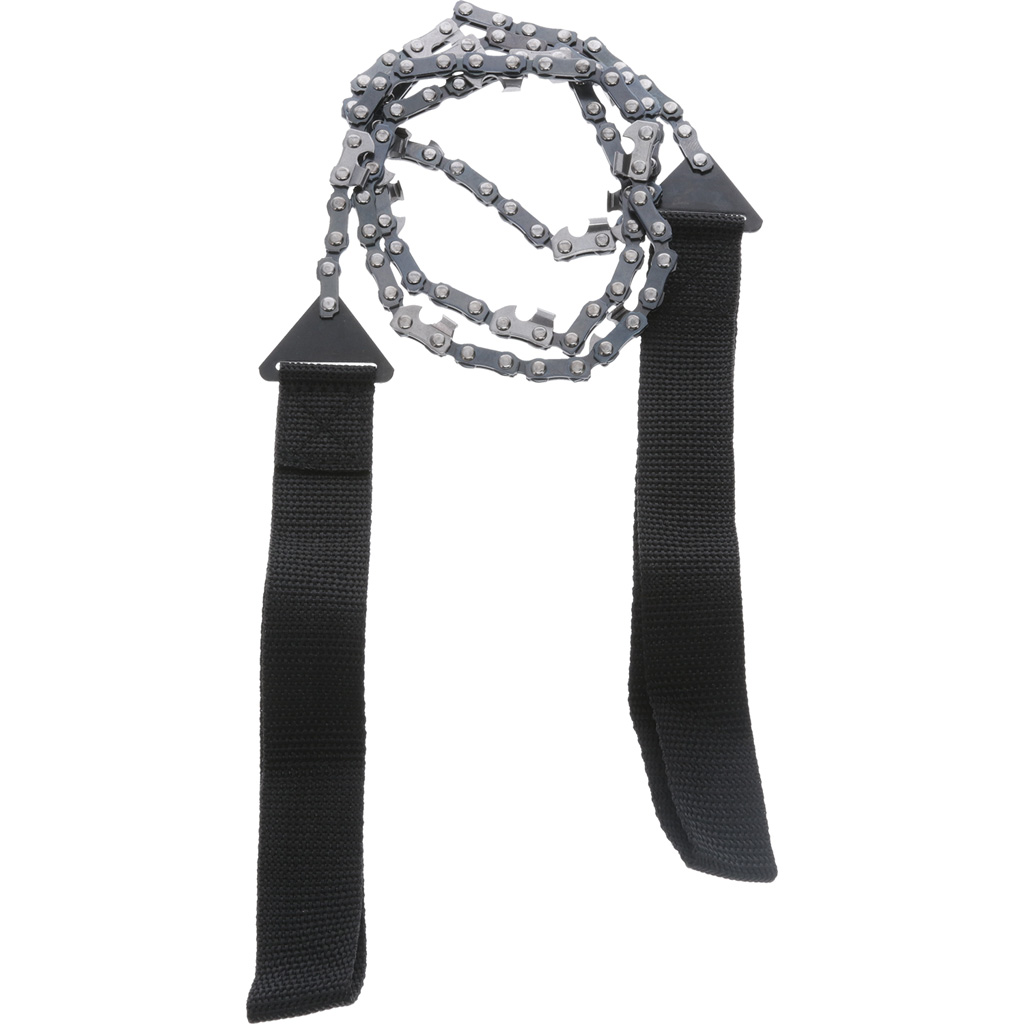 Features:36″ High carbon steel chain;Heavy duty stitched nylon wrist handles;Bi-directional cutting teeth;Compact & lightweight;Carry case included